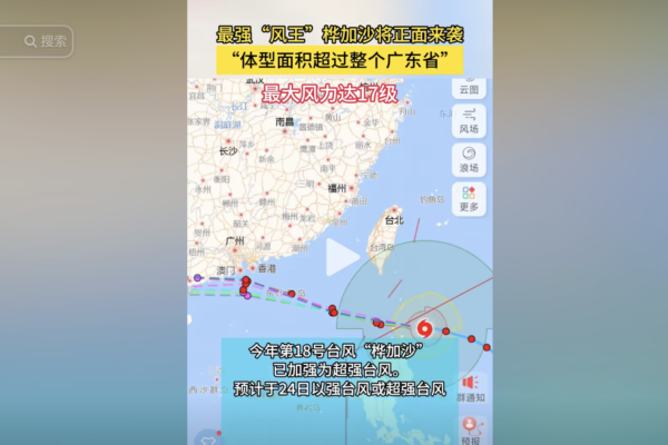 超强台风“桦加沙”正以惊人的威力逼近中国广东省,气象专家称其为“风王”,台风中心附近的最大风力已超过17级,覆盖面积更是超过整个广东省。预计在23日至25日期间,“桦加沙”将对广东的海面和陆地造成严重影响。