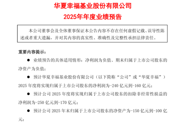 华夏幸福基业股份有限公司近日发布了其2025年度业绩预告,预计归属于上市公司股东的净利润将面临240亿元到160亿元的亏损。这一预告引发了市场的关注,也警示投资者该公司的股票可能面临退市风险。
