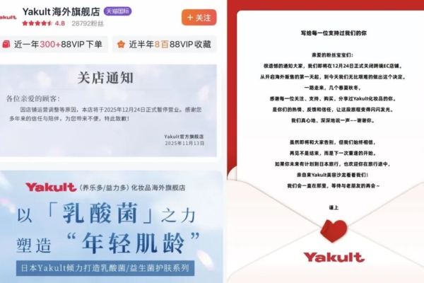 2025年12月,养乐多集团旗下的个护品牌Yakult在其天猫国际海外旗舰店发布了闭店通知,宣布停止跨境电商业务,并结束在中国市场的销售安排。该公告的截图随后被用户转发,引发了广泛讨论。